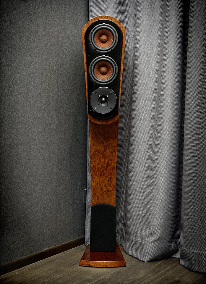 REEZOLDINI Master R3FS is the 2.5-way speaker system. Three active Scan-Speak Revelator drivers, manufactured upon Reezoldini’s request, are installed into speakers. Two midbass drivers in the d’Apollito scheme sound the lower and the middle register. One of them works in its full range, the second works in the lower register. This inclusion of the speakers provides good linearity, gives excellent depth, attack, and articulation of bass. Drivers of the same size and type have the same inertia of mobile systems, whereby they give synchronous response and wide beam pattern. Identical tonal signature of all drivers has a beneficial effect on sound.