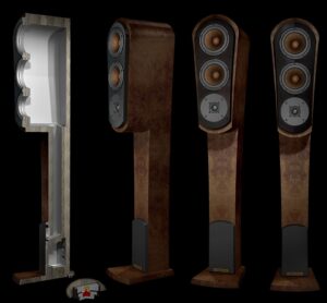 Speaker Cabinet is made of MDF. The internal volume is designed in such a way as to neutralize interference distortion. The large bass reflex port is placed outside the cabinet and packed in a rack, SRPI (Stand and Reflex Port Integrated). This solution allows obtaining the necessary characteristics of the port with a small volume of the cabinet, improve system performance and maintain an elegant appearance. At the assembly stage, in the array of the speaker cabinet and the phase inverter, the cavities, whereinto “Julin’s buffer” is embedded, are made. The walls of the cabinet in the thinnest spot is 25 mm thick. The front panel is attached to the cabinet via a vibration-damping compound. The total thickness of the front panel is 43 mm.